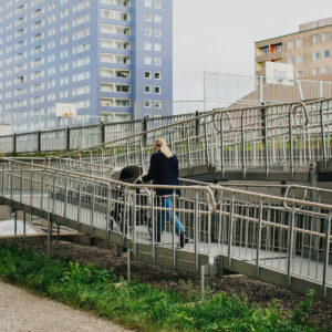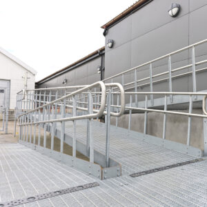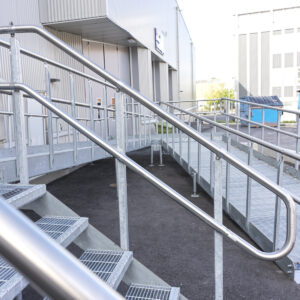 Our complete wheelchair ramps are manufactured in grating, including railings, stringers and requisite supporting legs. They are based on a simple, robust design in hot dipped steel, which adds to the stability and long durability. The incline of the gangways is adjustable, but is not permitted to exceed 1:12. Contrast markings are placed on the front edge of the ramp and at the start of the landing. Thanks to stocked standard components, we guarantee short delivery times. We also have a large stocked assortment of ramps in width 900 mm with short delivery times.