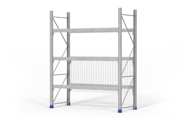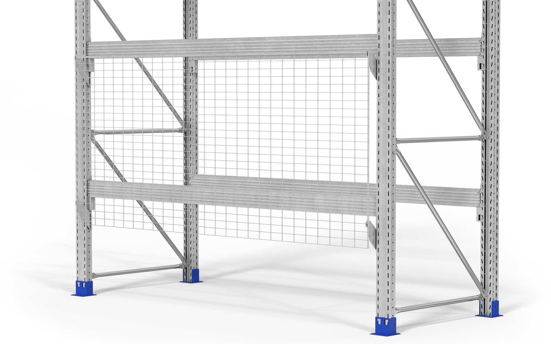 Net grating for end panel and long side, which is mounted along the support beams to prevent goods from falling out of the pallet rack.