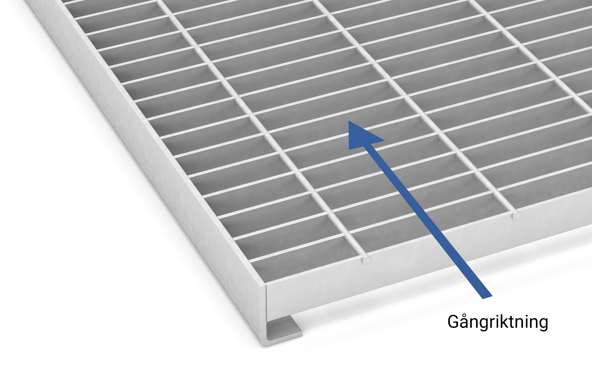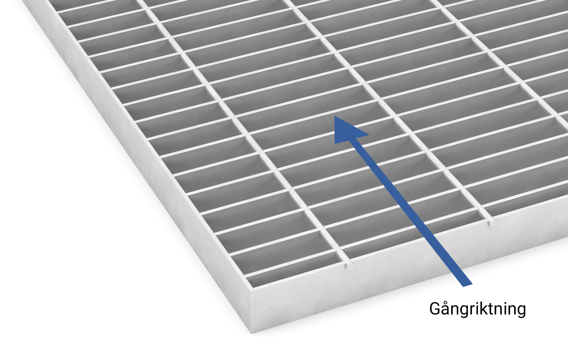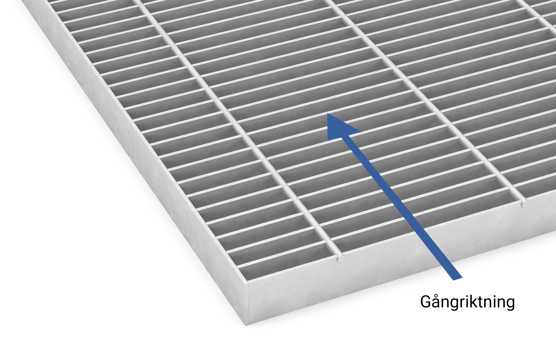 Gångriktning, viktigt att tänka på! Beroende på vilken typ av gallerdurk du väljer till din entré ska bärstängerna placeras rätt. För entrégaller typ A ska bärstängerna placeras parallellt med gångriktningen. När pressvetsad gallerdurken används blir gångriktningen vinkelrätt med bärstängerna. Läs och se mer information på vår projekteringssida.