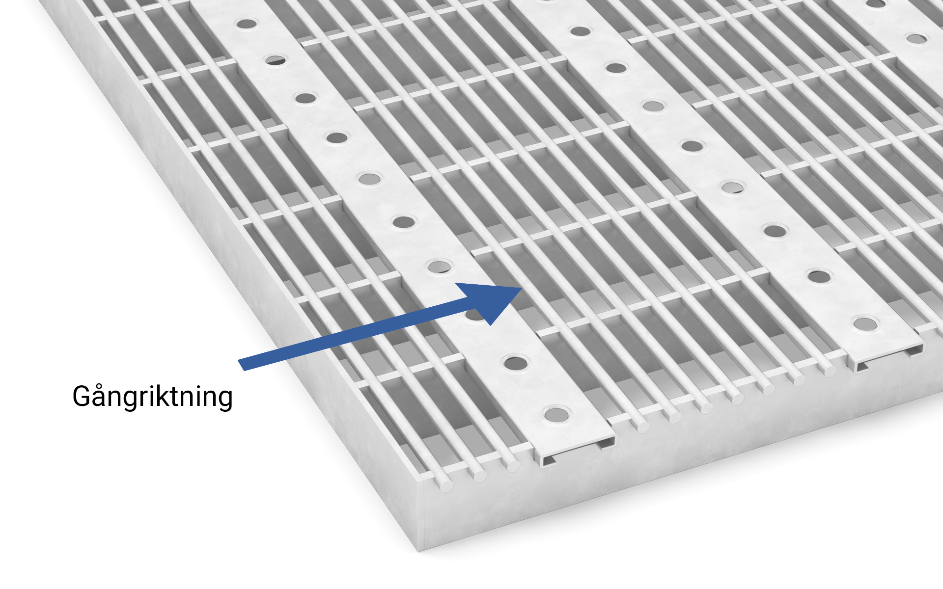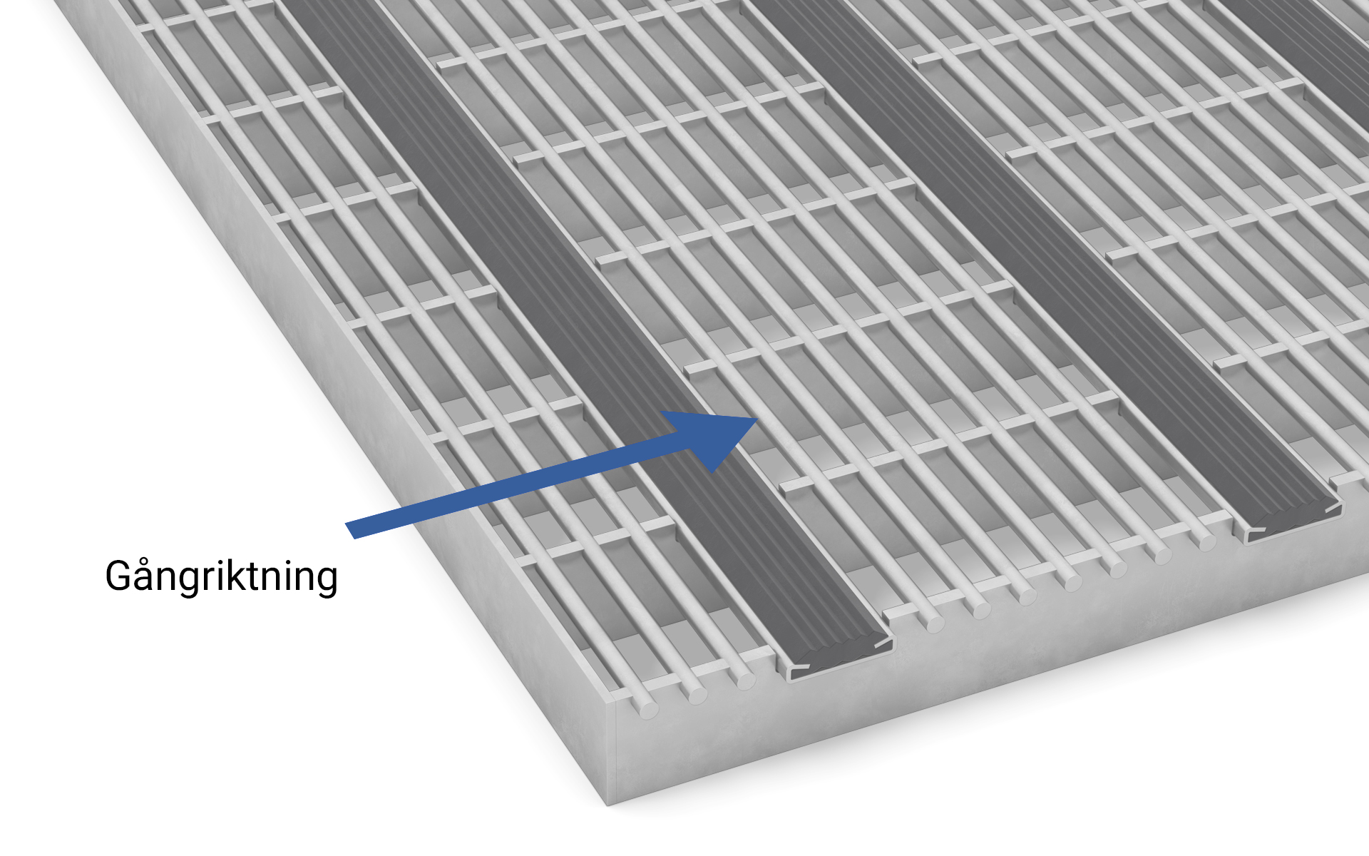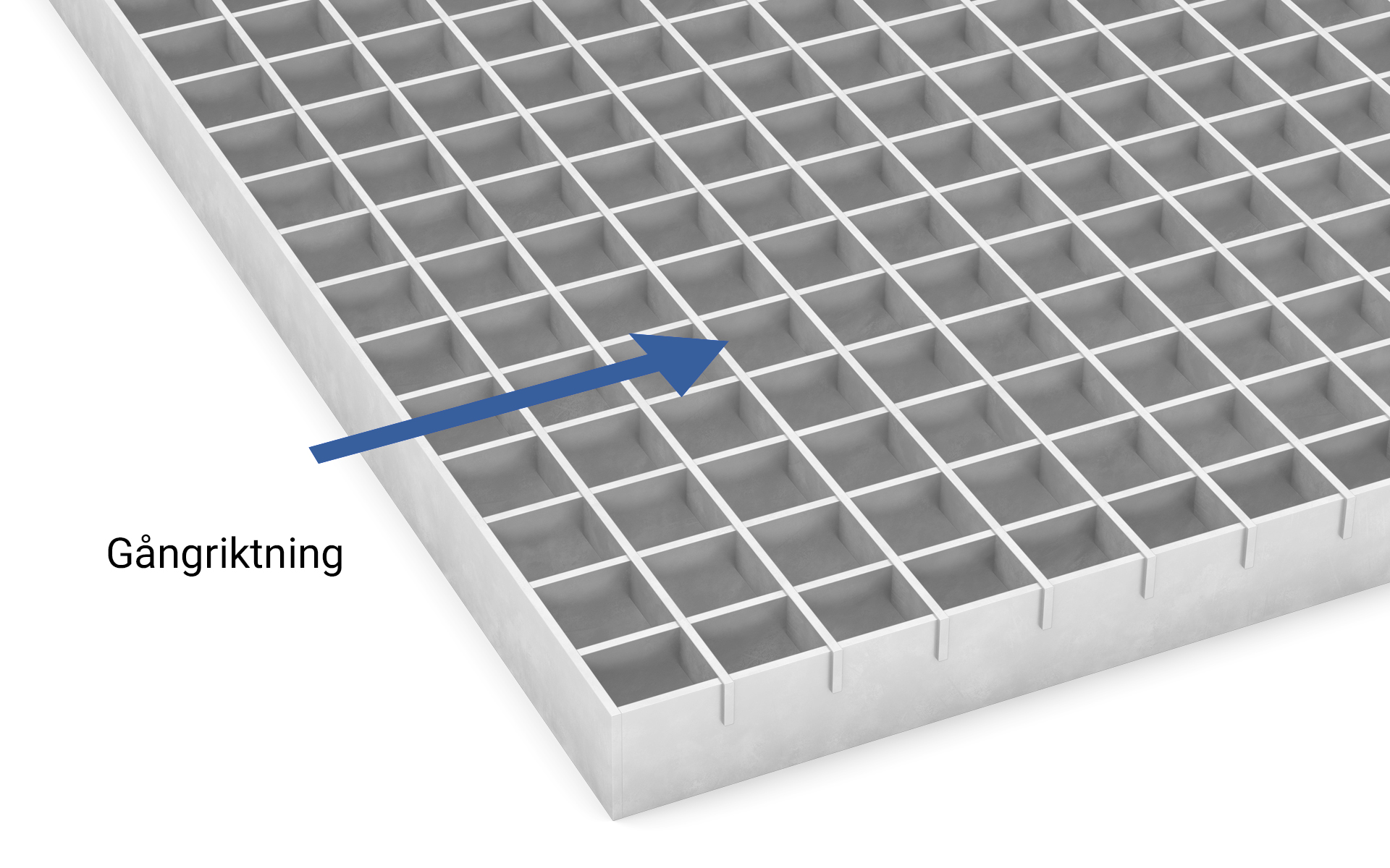 Gångriktning, viktigt att tänka på! Beroende på vilken typ av gallerdurk du väljer till din entré ska bärstängerna placeras rätt. För entrégaller typ A ska bärstängerna placeras parallellt med gångriktningen. När pressvetsad gallerdurken används blir gångriktningen vinkelrätt med bärstängerna. Läs och se mer information på vår projekteringssida.