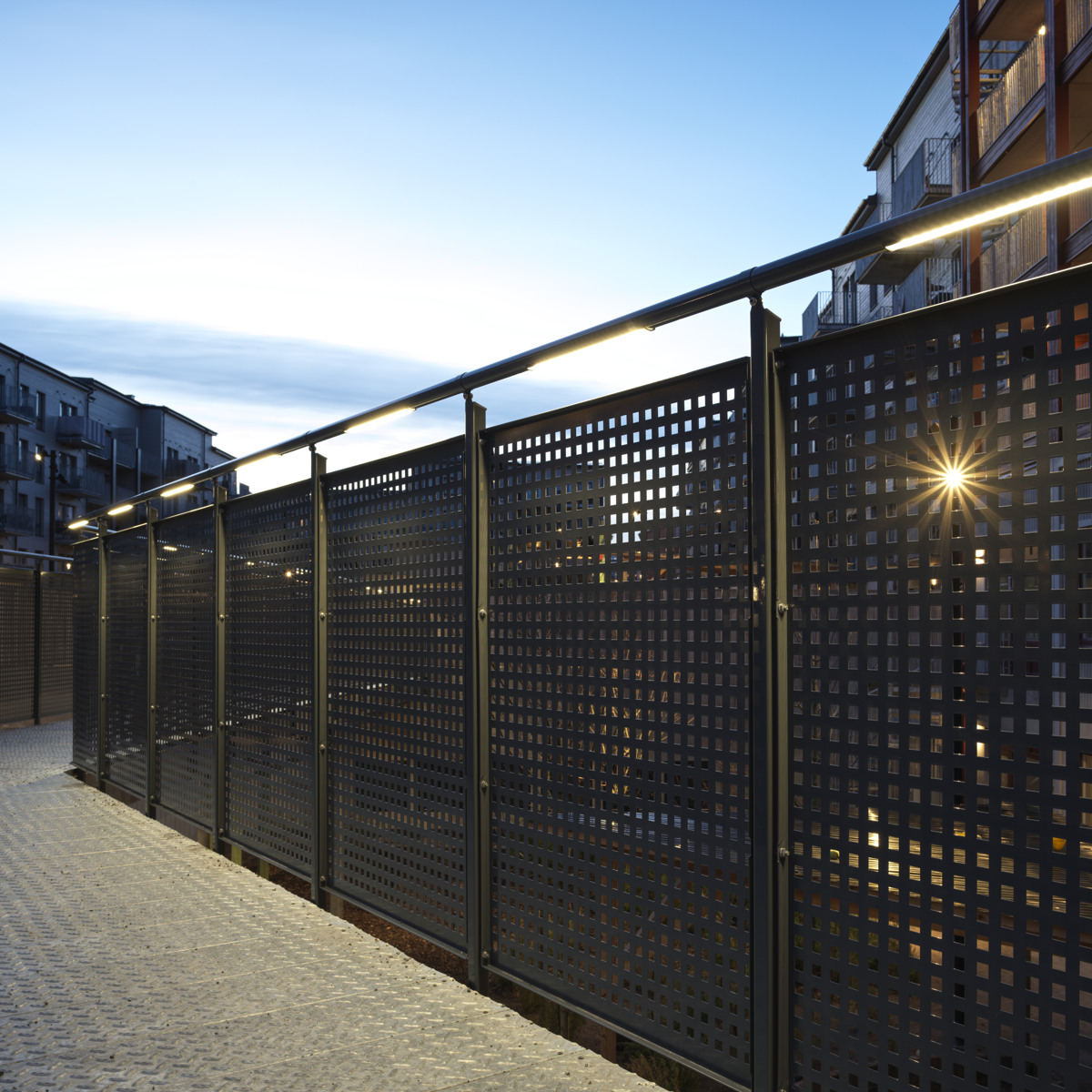 Räcke i tät eller perforerad plåt. Barnsäkert med maximal öppning 100 mm.